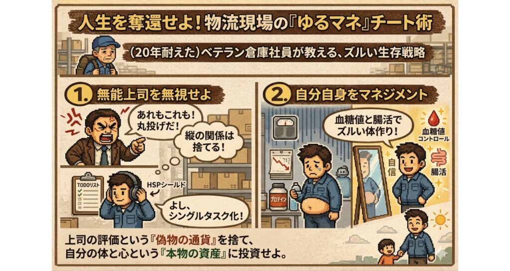 この記事を読めば、上司の機嫌を伺うのをやめ、自分のペースで仕事をさばきながら、いつの間にかお腹も凹んでいく「人生の生存戦略(チート術)」が手に入ります。